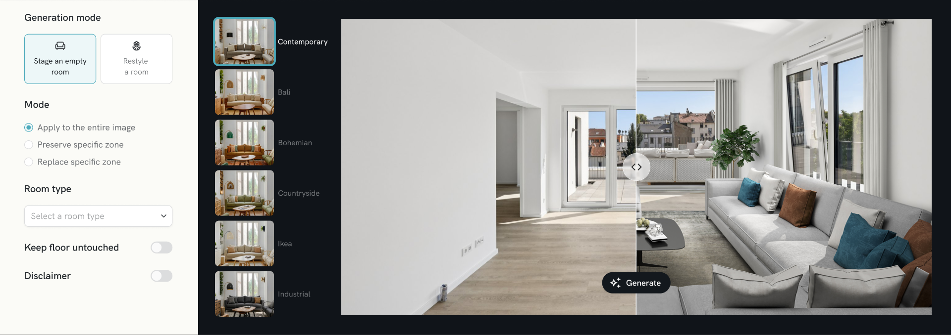 El staging virtual con IA ya está disponible y transforma al instante sus fotos de propiedades. Convierta habitaciones vacías en espacios totalmente amueblados, actualice interiores fuera de moda con estilo moderno o elimine el desorden para mostrar habitaciones limpias y listas para entrar a vivir.